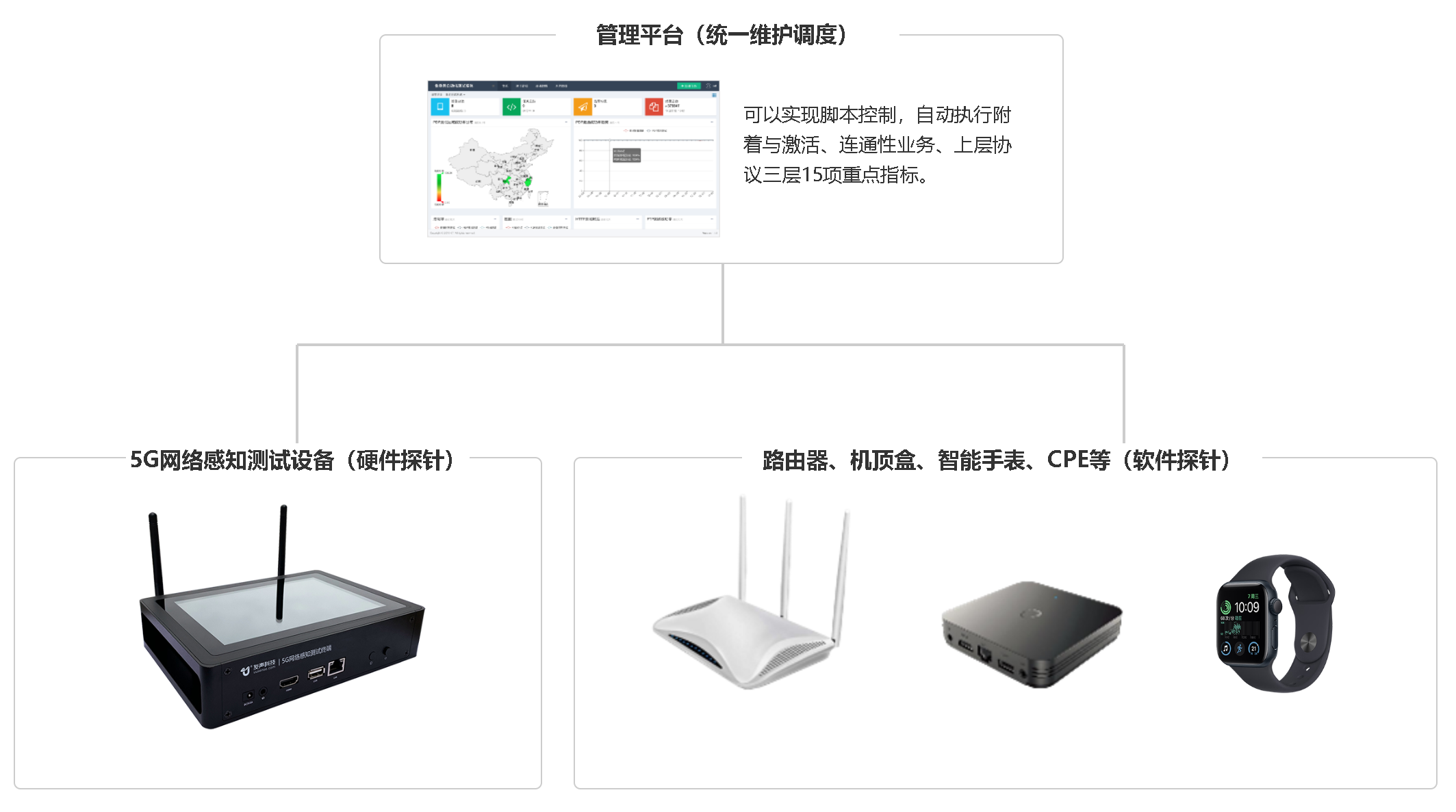 利用友声5G网络感知测试设备,以及配套的软件系统,能够针对各种物联网场景下的设备卡进行远程批量测试,并进行测试任务、资源的集中调度管理,无需人工干预,高效便捷。